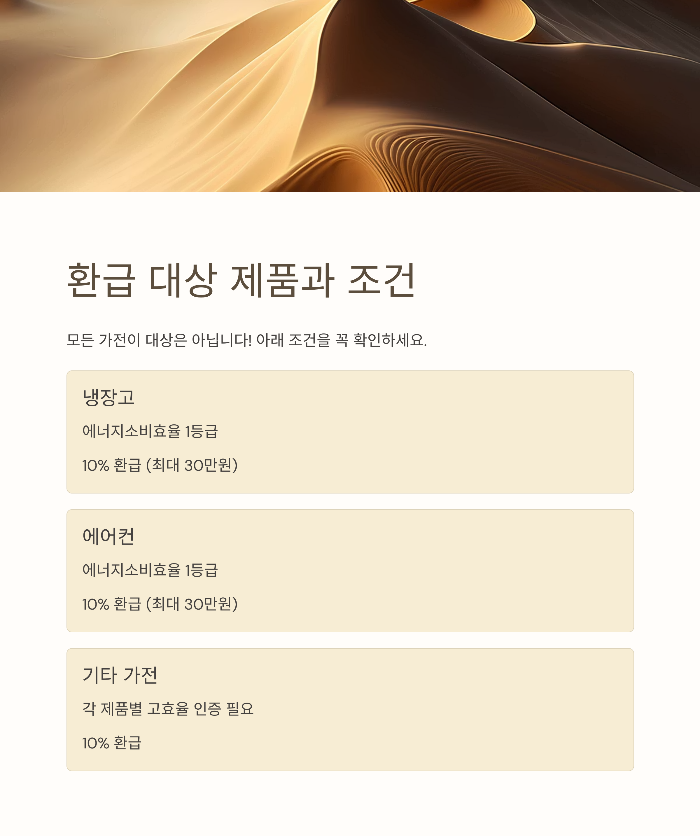 모든 가전제품이 다 환급 대상은 아니에요. 아래 표처럼 정해진 제품군과 조건을 만족해야만 합니다. 특히 '에너지 소비효율 1등급'이거나 정부 인증 마크가 있어야 인정됩니다. 구매 전 제품 라벨 꼭 확인하세요!