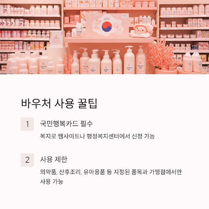 의약품, 산후조리, 유아용품 등 지정된 품목과 가맹점에서만 사용할 수 있어요. 일반 소비에는 제한됩니다.